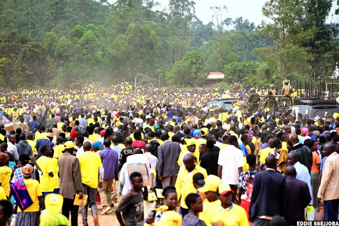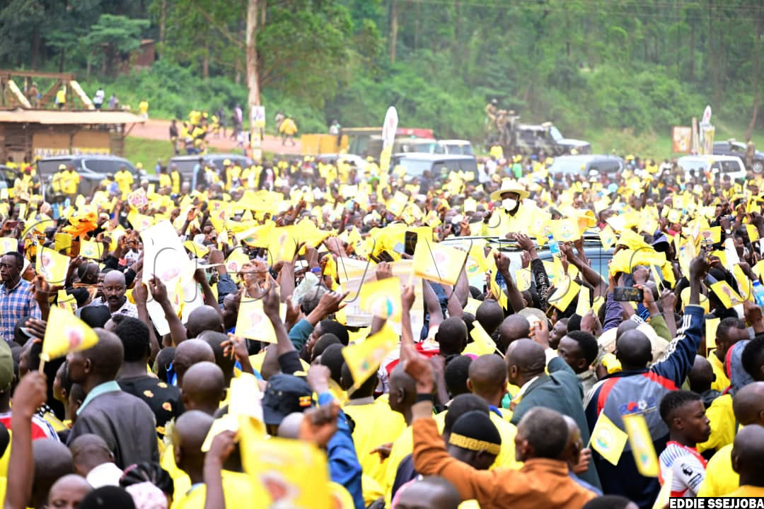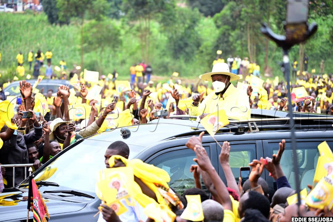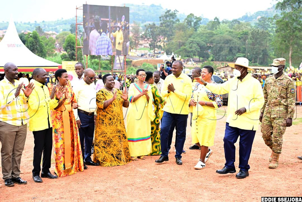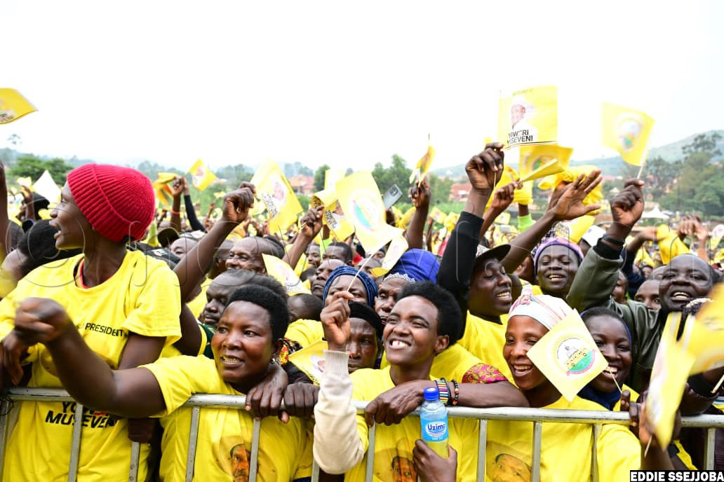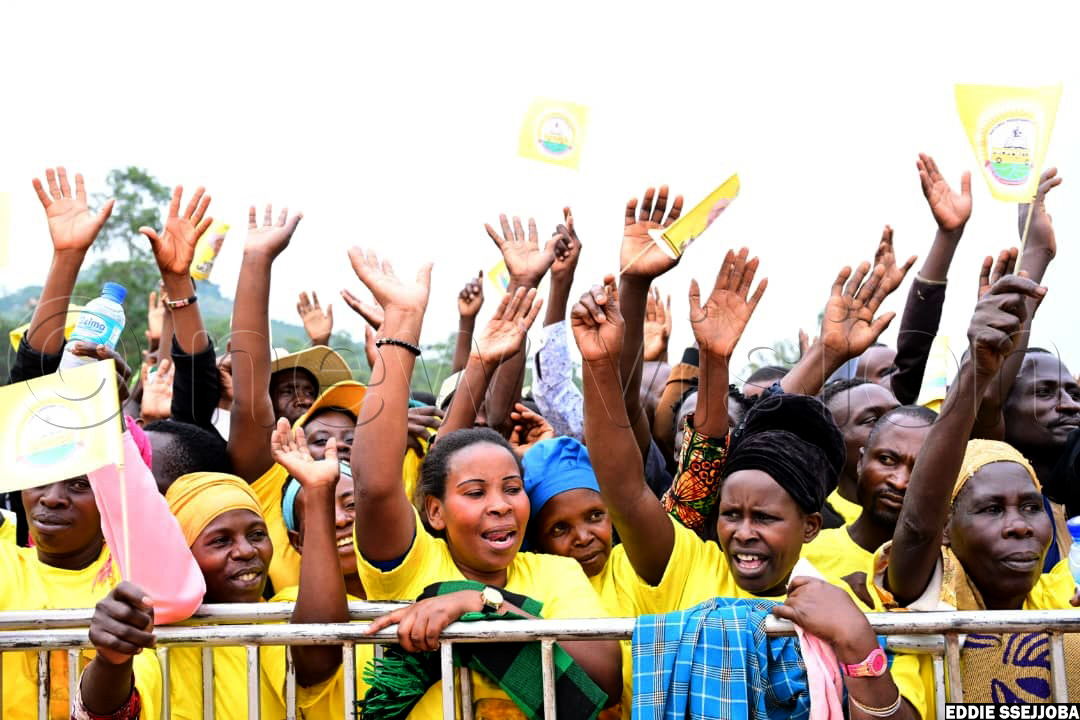 This drew huge cheers and laughter from the mammoth crowd that was clad in yellow T-shirts and waving mini flags bearing Museveni’s image.