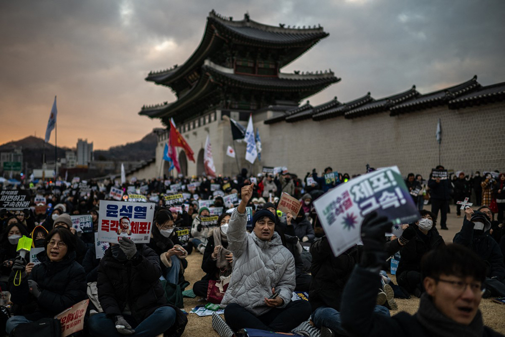 People chant slogans during a rally held to protest against impeached South Korea's president Yoon Suk Yeol in front of the Gwanghwamun Gate in Seoul on January 4, 2025. (Photo by Philip FONG / AFP)