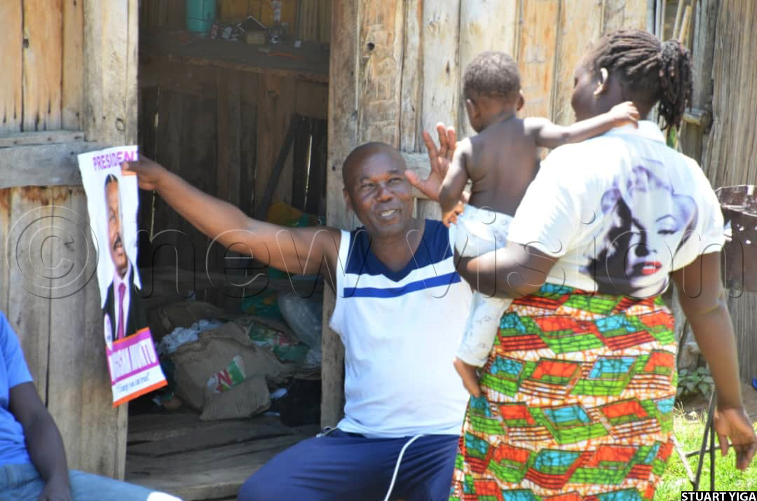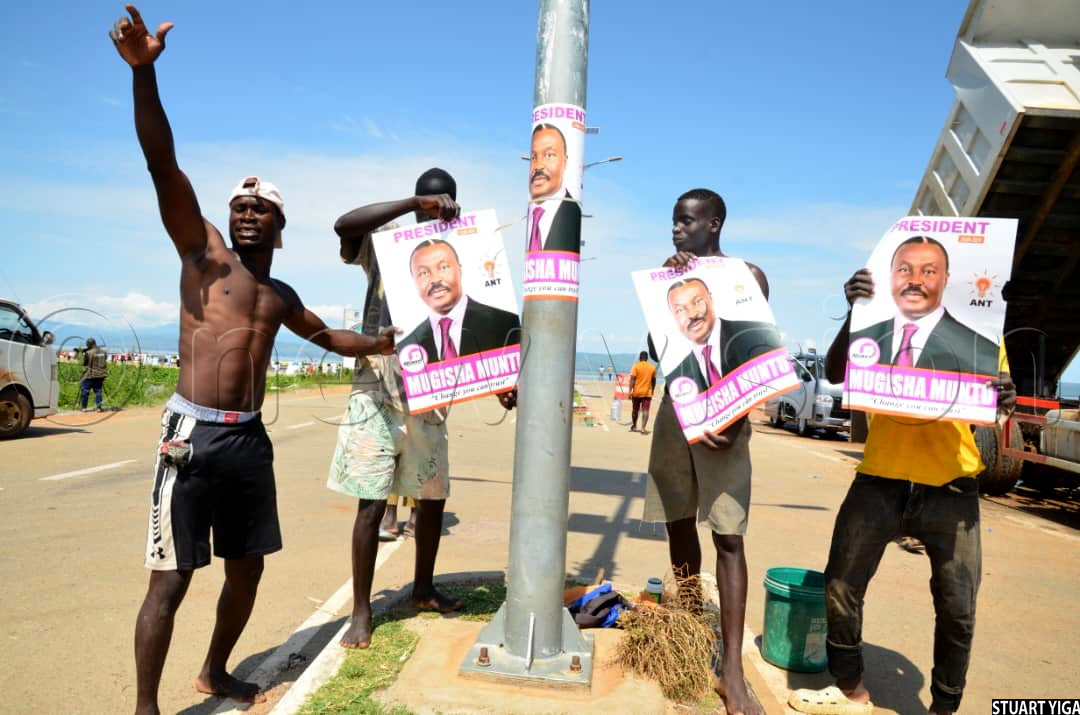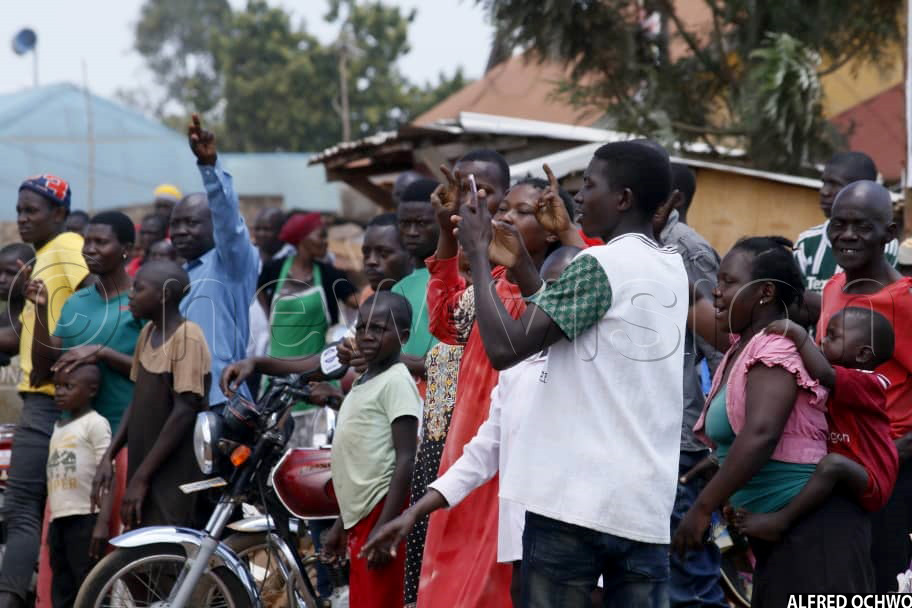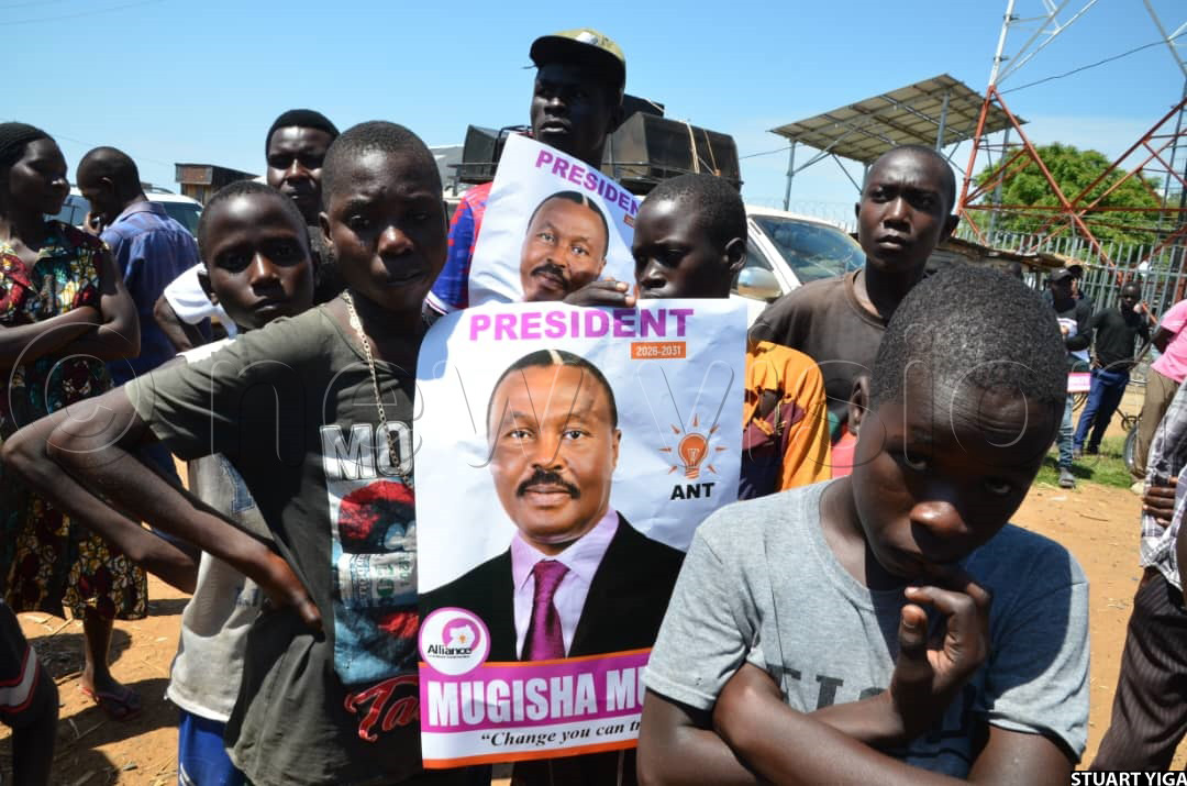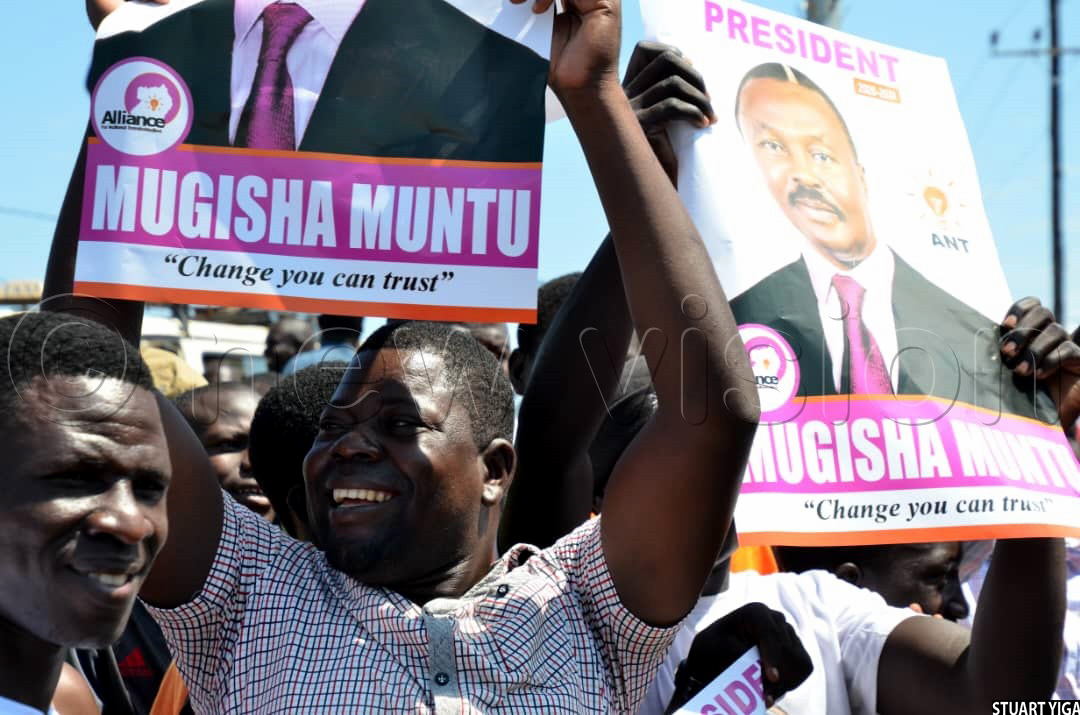 In anticipation of the ANT presidential candidate, Mugisha Muntu, supporters waved his posters and chanted slogans. Upon his arrival, they converged to listen to his campaign message.