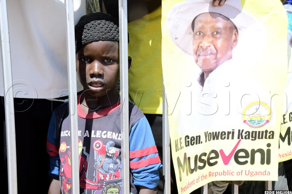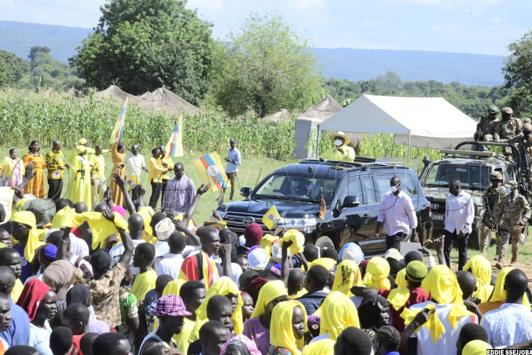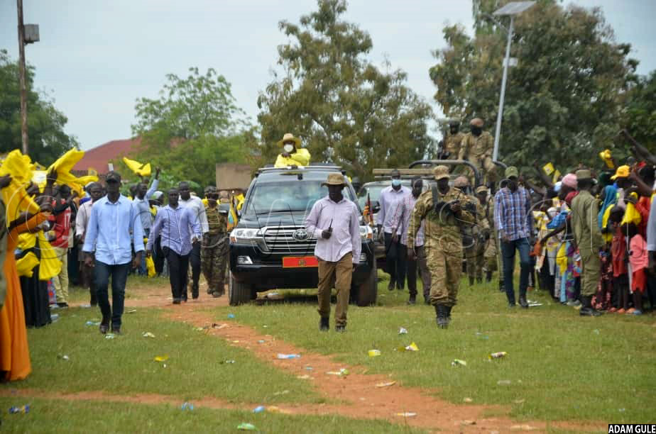 President Yoweri Museveni arrives at one of the venues where enthusiastic NRM supporters gathered to welcome and show their support for his re-election bid.