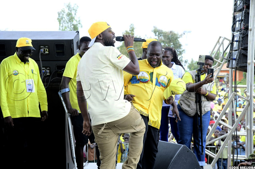 While on stage, Kenzo performed a number of his popular songs, including Sitya Loss, which he is famed for, as the ecstatic crowd waited for Museveni to arrive for his first campaign rally of the day.
