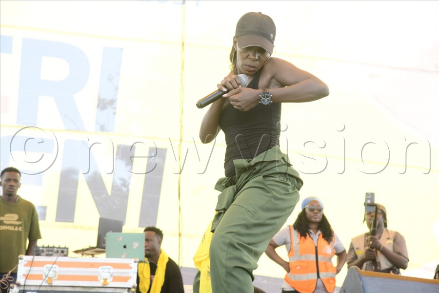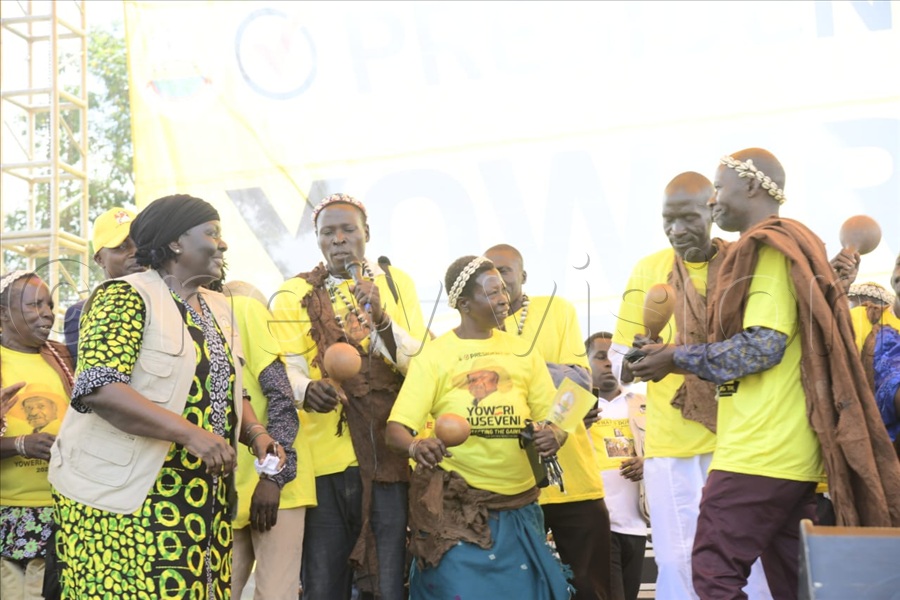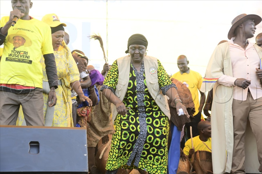 Legendary musician Phina Mugerwa Masanyalaze entertains NRM supporters at Kyabazinga Grounds in Bugweri district ahead of President Yoweri Museveni’s first campaign rally of the day.