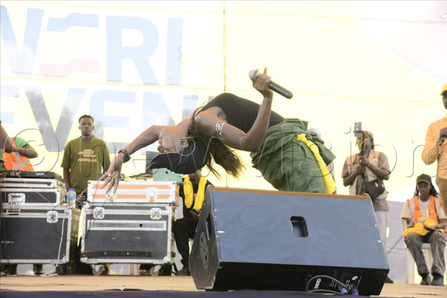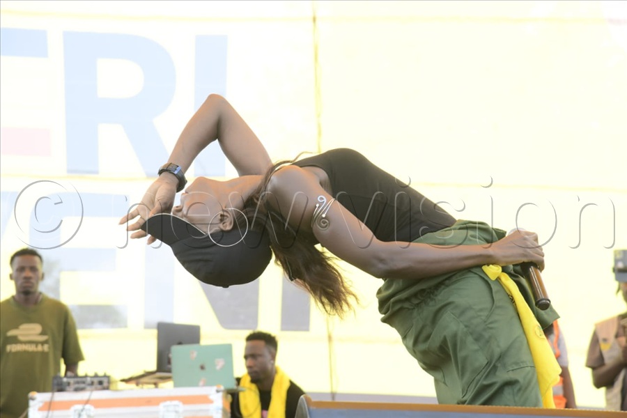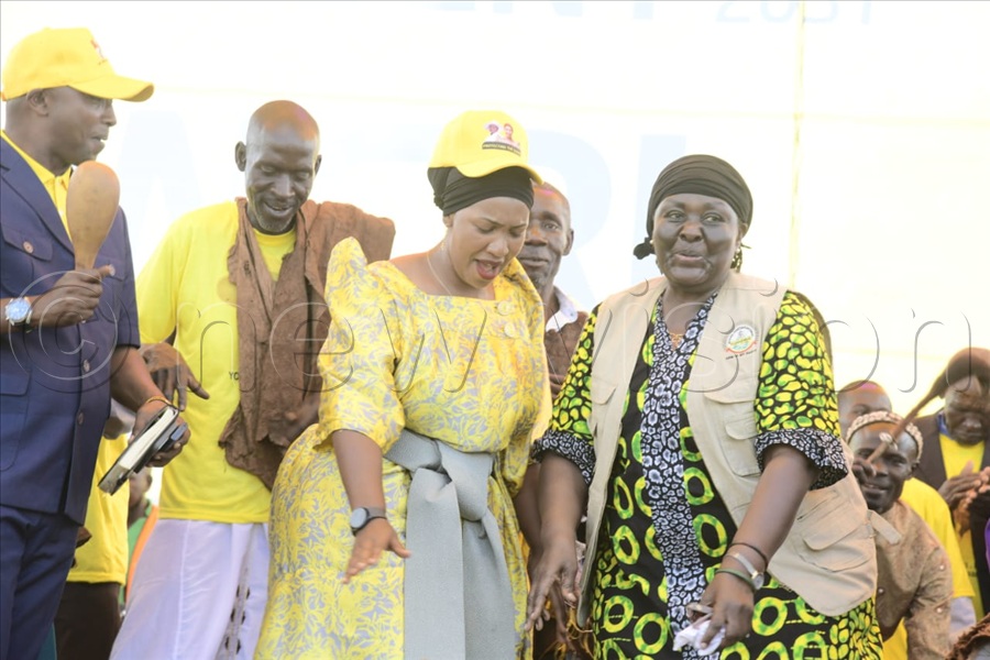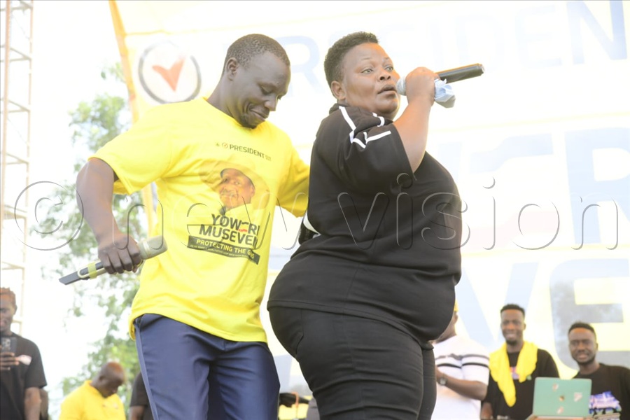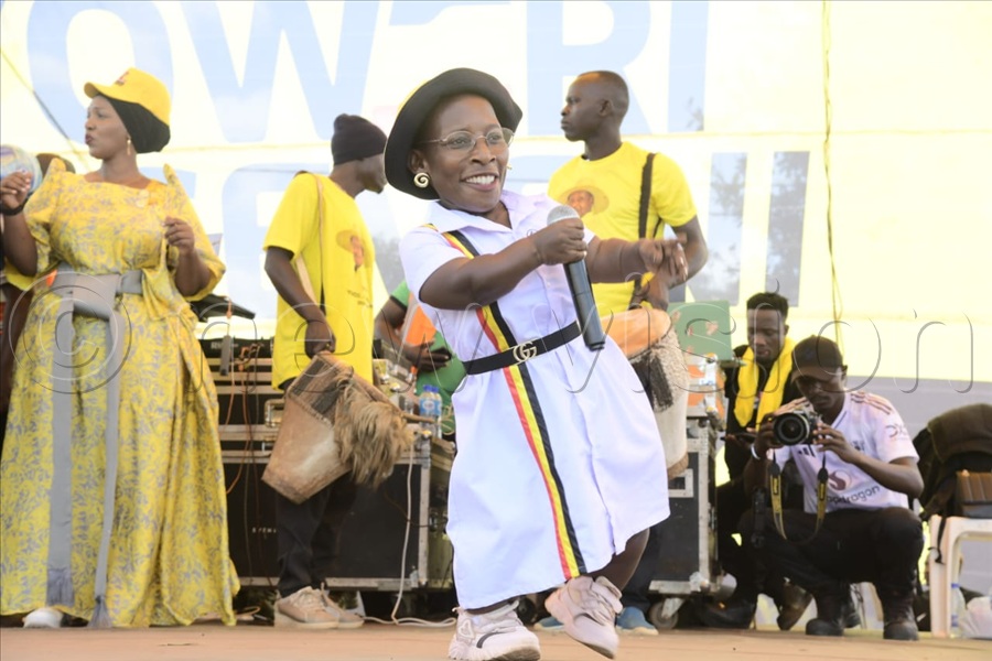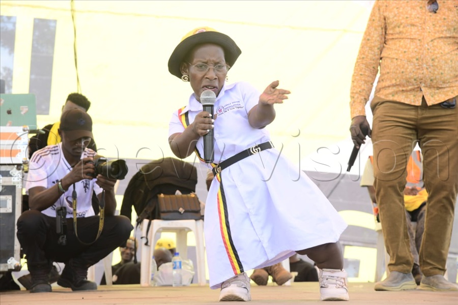 Violet Mbabazi, alias Omuyimbi wa Museveni, also the councillor at Kassanda district representing people with disabilities, entertains NRM supporters at Kyabazinga Grounds in Bugweri district.