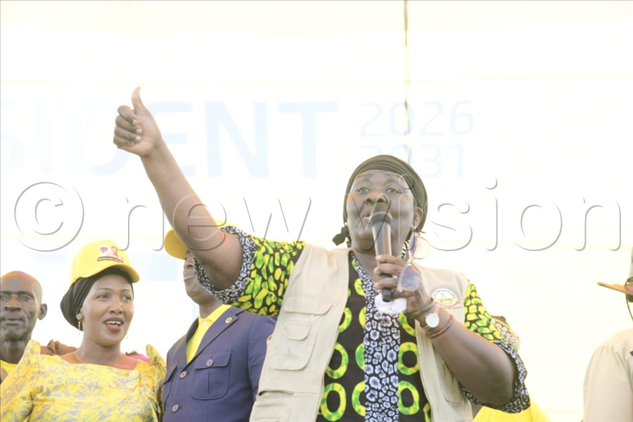 Uganda's former and First Vice President Speciosa Naigaga Wandira Kazibwe speaking to NRM supporters at Kyabazinga Grounds in Bugweri district ahead of President Yoweri Museveni’s first campaign rally of the day.