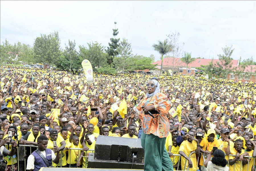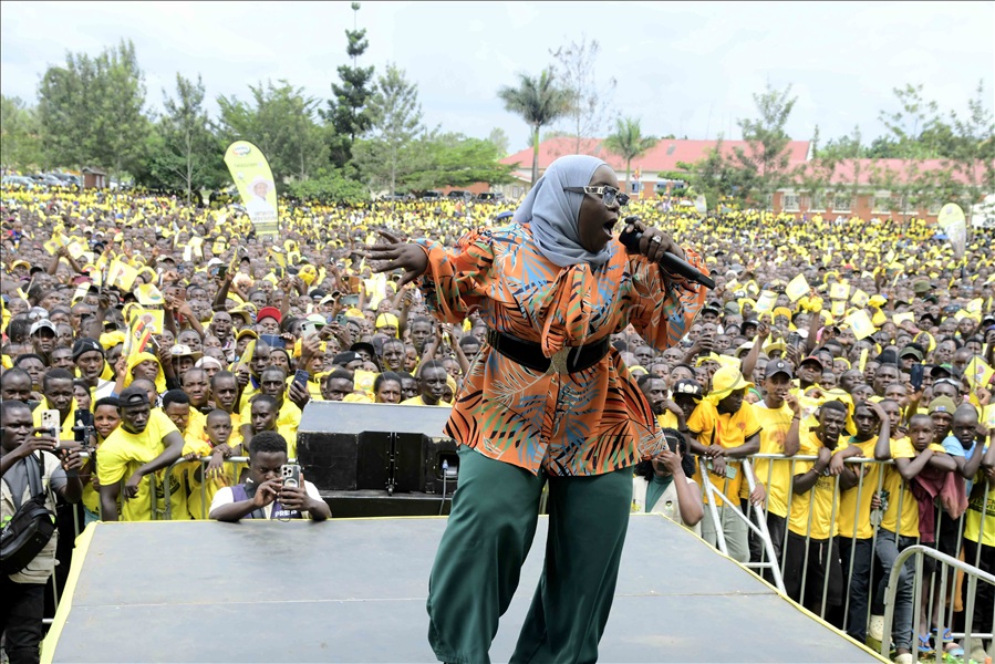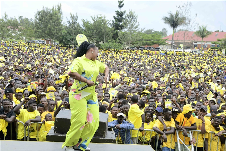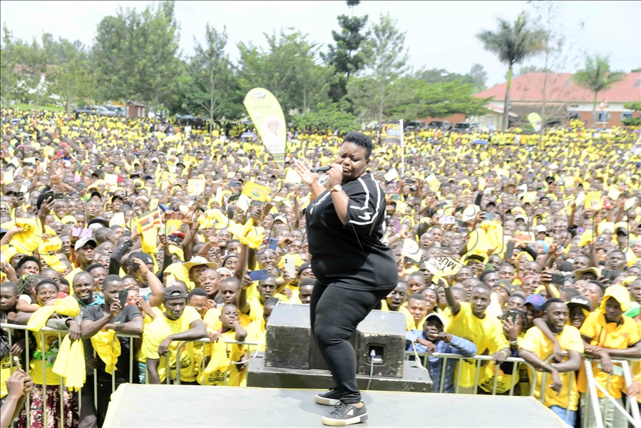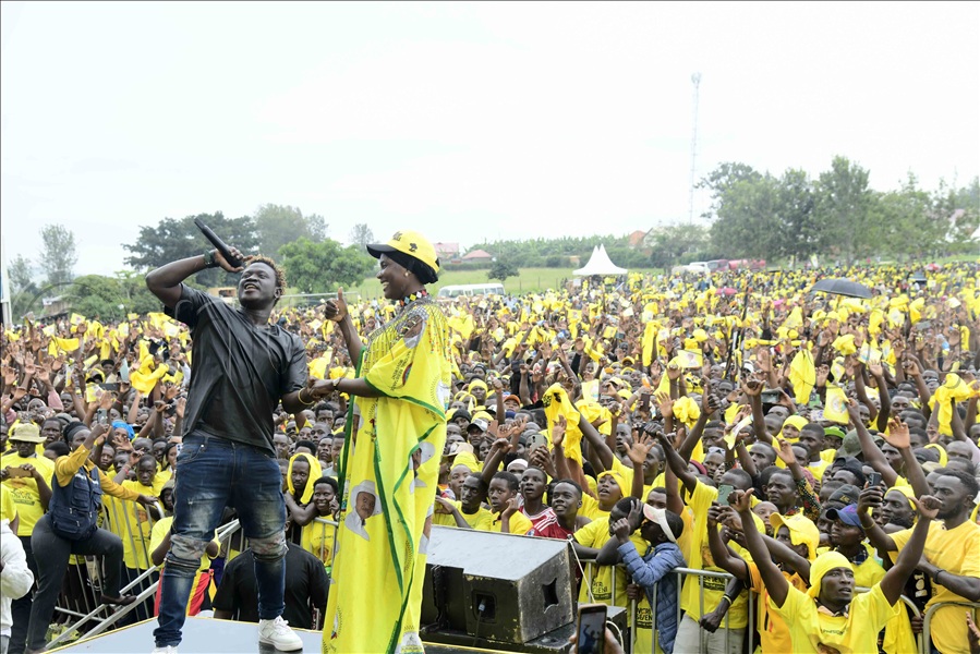The president and First Lady wave at NRM supporters, upon arrival at Kyamate Primary School playground for the NRM mega rally.