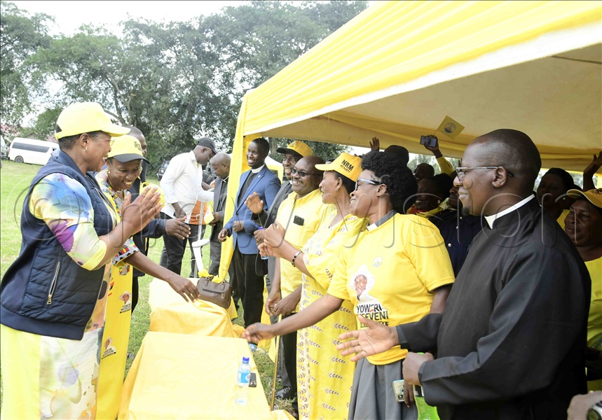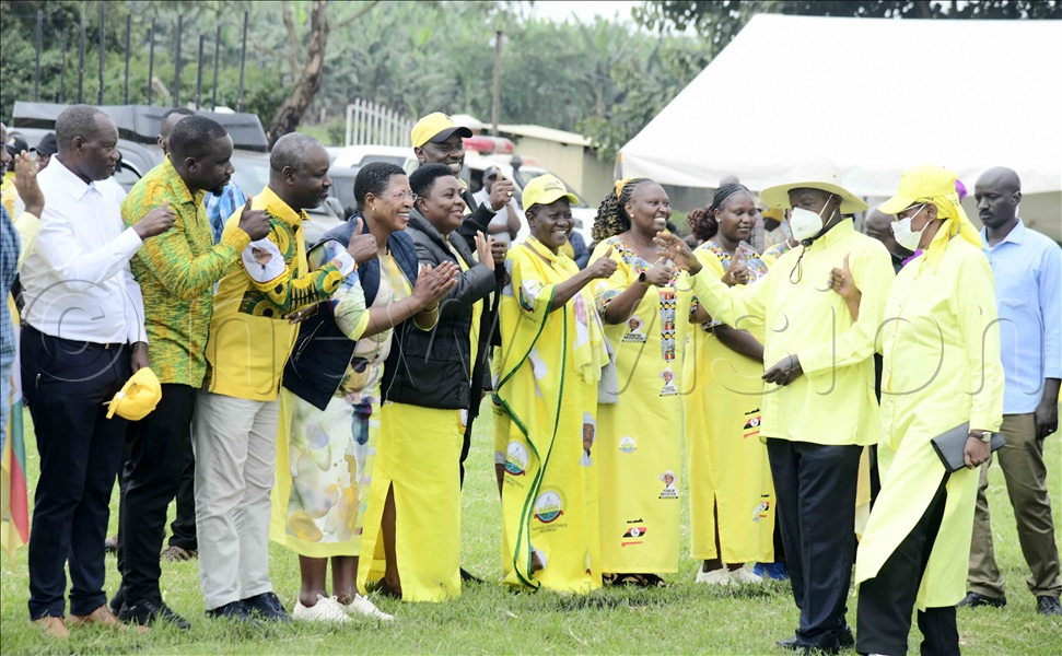 President Yoweri Museveni and the First Lady greet NRM officials as they arrived at Kyamate Primary School playground for the latter's rally.