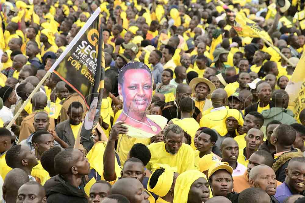 Jubilant NRM supporters display the First Lady's portrait as she arrived for a rally in her home Ntungamo district.