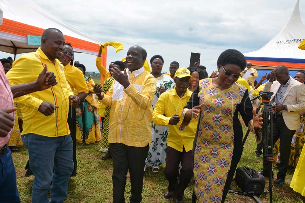 Dr Tanga Odoi (L), the NRM Electoral Commission Chairperson invited all the aspirant to introduce themselves to the Kikuube district NRM delegates. (Peter Abaanabasazi)