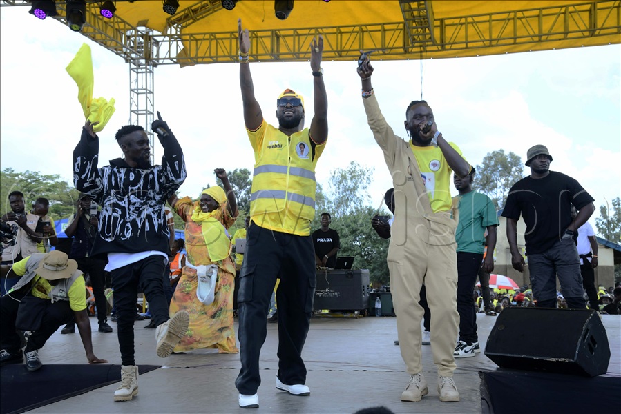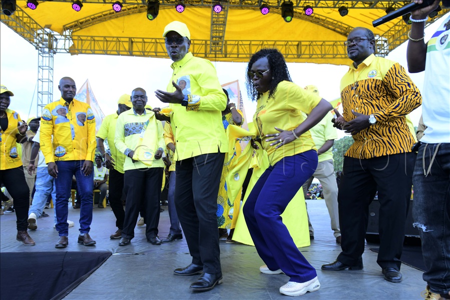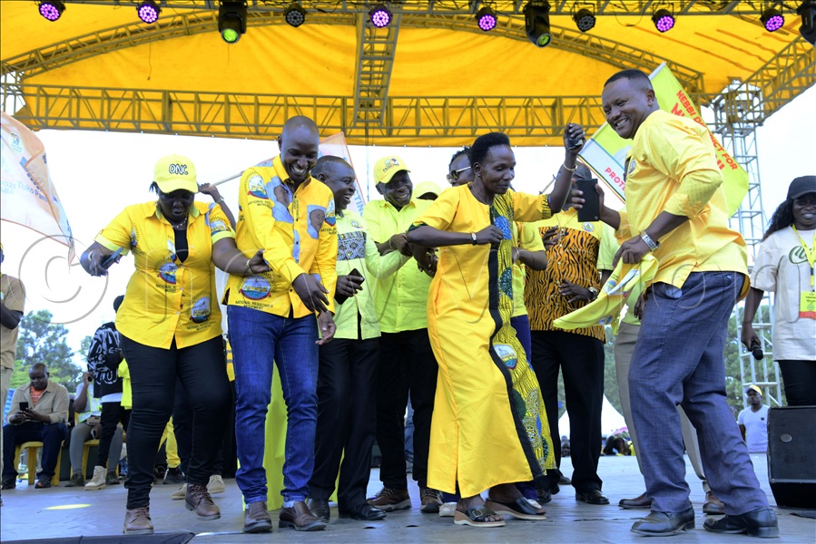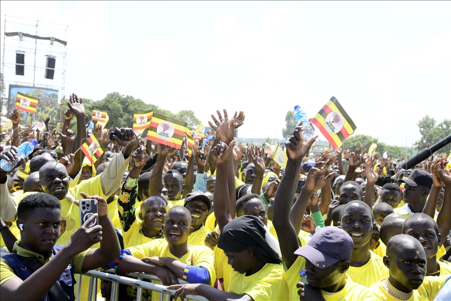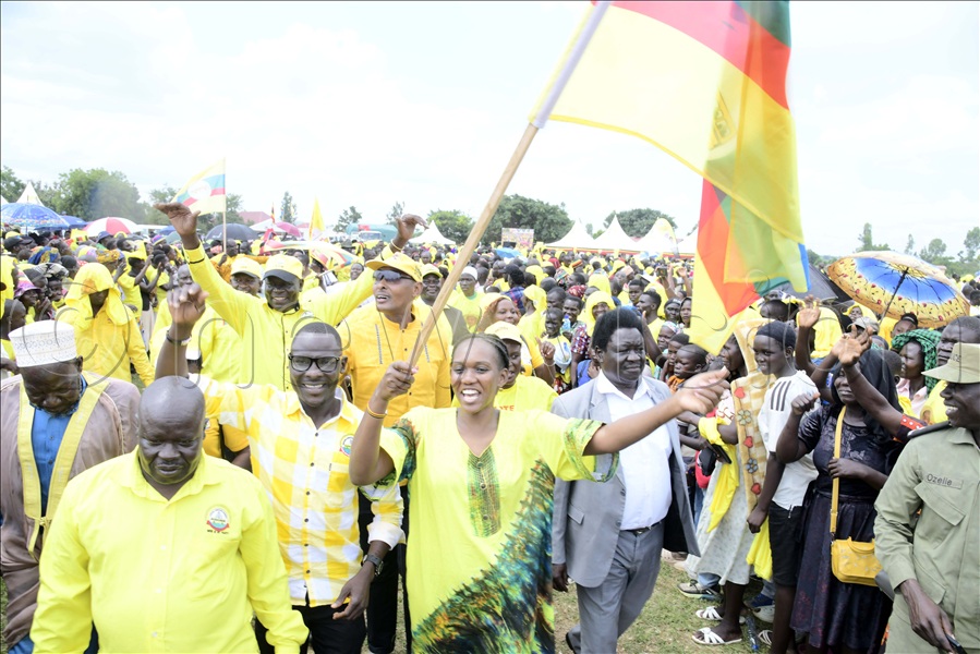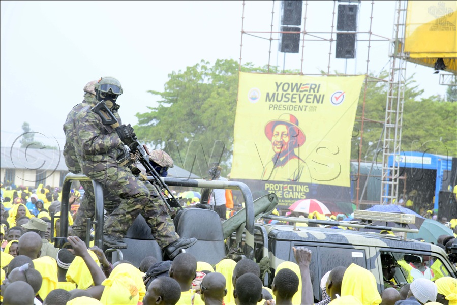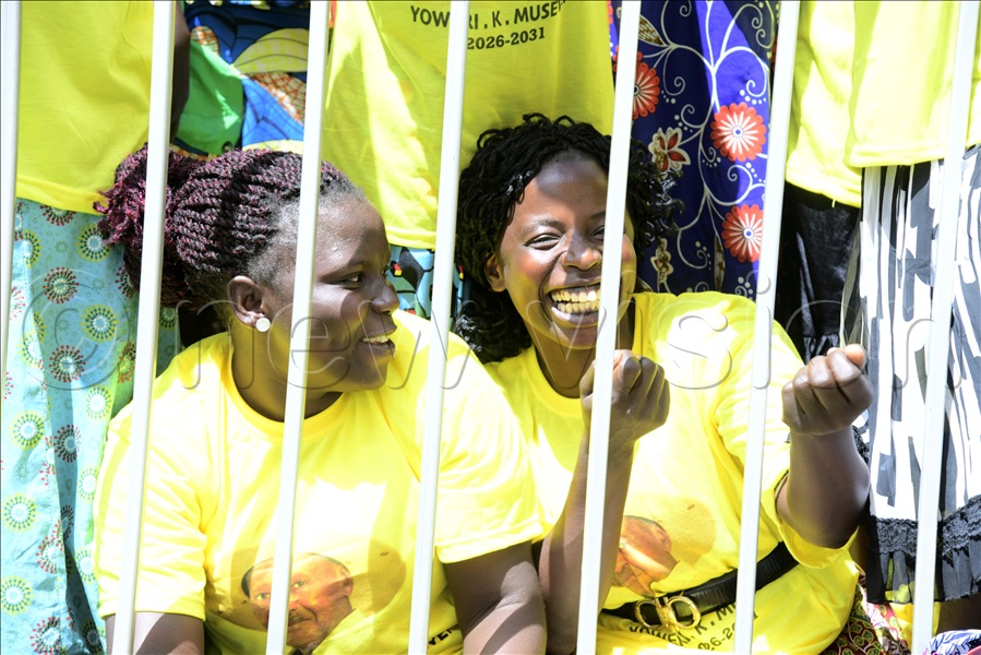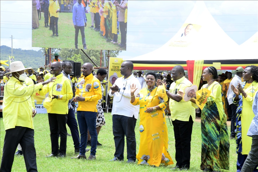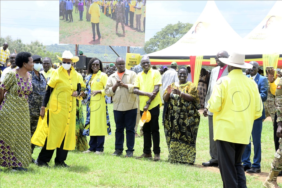 Museveni stood in his open-roof car with the First Lady, both waving and thumbing up to the yellow-donned cheering crowd.