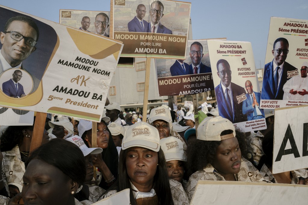 Supporters of presidential candidate Amadou Ba, the governing coalition's candidate and ex-prime minister, hold signs as they wait before his last campaign meeting in Dakar on March 22, 2024. AFP photos