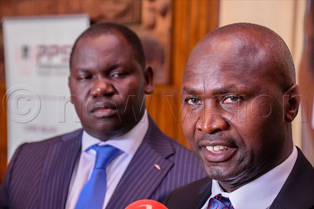 Theodore Ssekikubo, Lwemiyaga county MP speaks to the press at Parliament on May, 30 2024. Looking on is Jonathan Ebwalu, Soroti West MP. Photos by Miriam Namutebi.