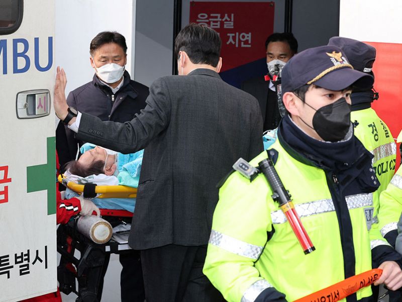 South Korean opposition party leader Lee Jae-myung, who was attacked in Busan, lies on a stretcher as he arrives at Seoul National University Hospital in Seoul on January 2, 2024.AFP