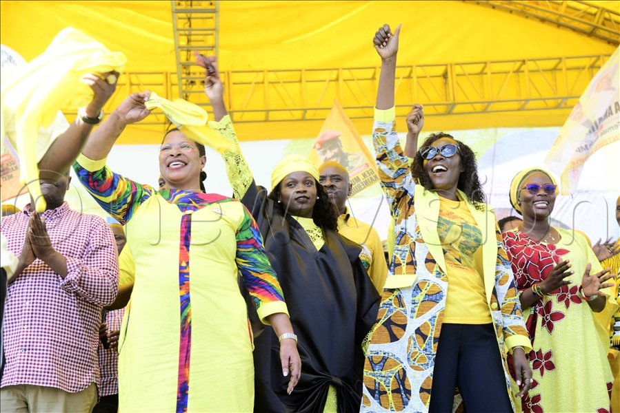 The Speaker of Parliament, Annet Anita Among, and state minister for investment, Evelyn Anite (R), celebrate with NRM supporters on stage at Arua Golf Course, where President Museveni later addressed a rally during his campaign trail in West Nile.