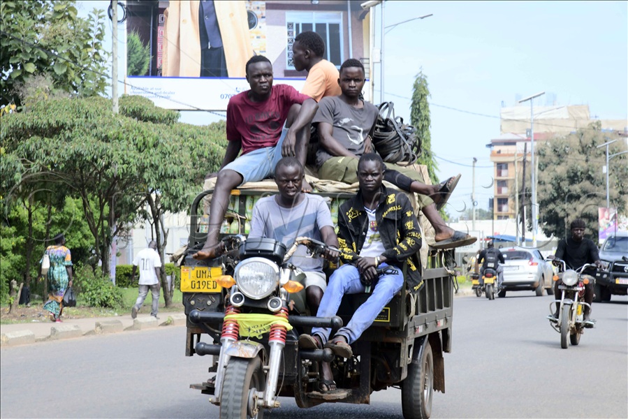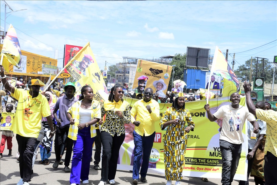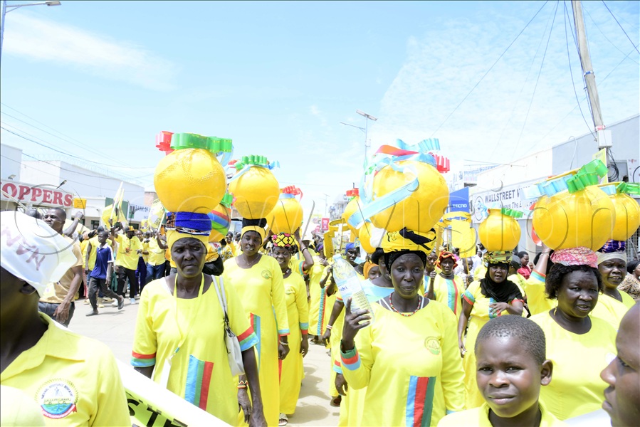 NRM supporters march through Arua City with yellow painted pots on their heads. They were part of a procession to welcome President Yoweri Museveni in Arua City.
