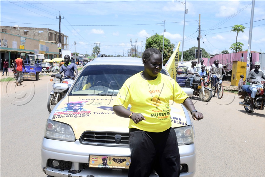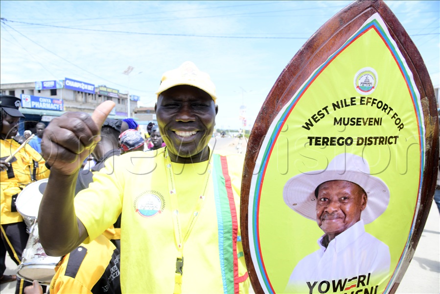 An NRM supporter holds a shield with the portrait of President Yoweri Museveni during a procession in Arua City.