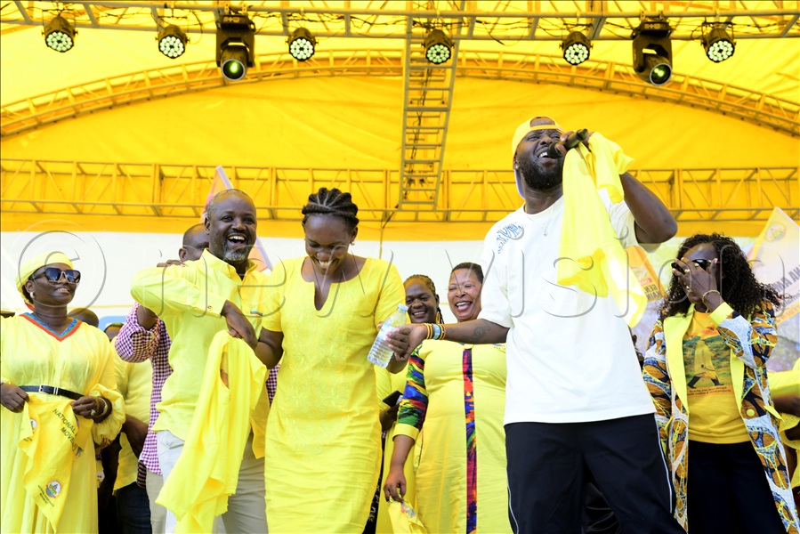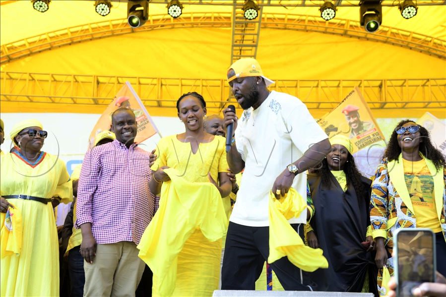 Eddy Kenzo performs on stage together with state minister Phionah Nyamutoro as state minister for children and youth, Balaam Barugahara looks on.