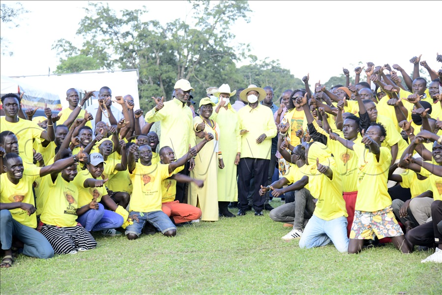 President Yoweri Museveni and First Lady Janet Museveni in a group photo with the NRM new converts at the Golf Course in Arua City.