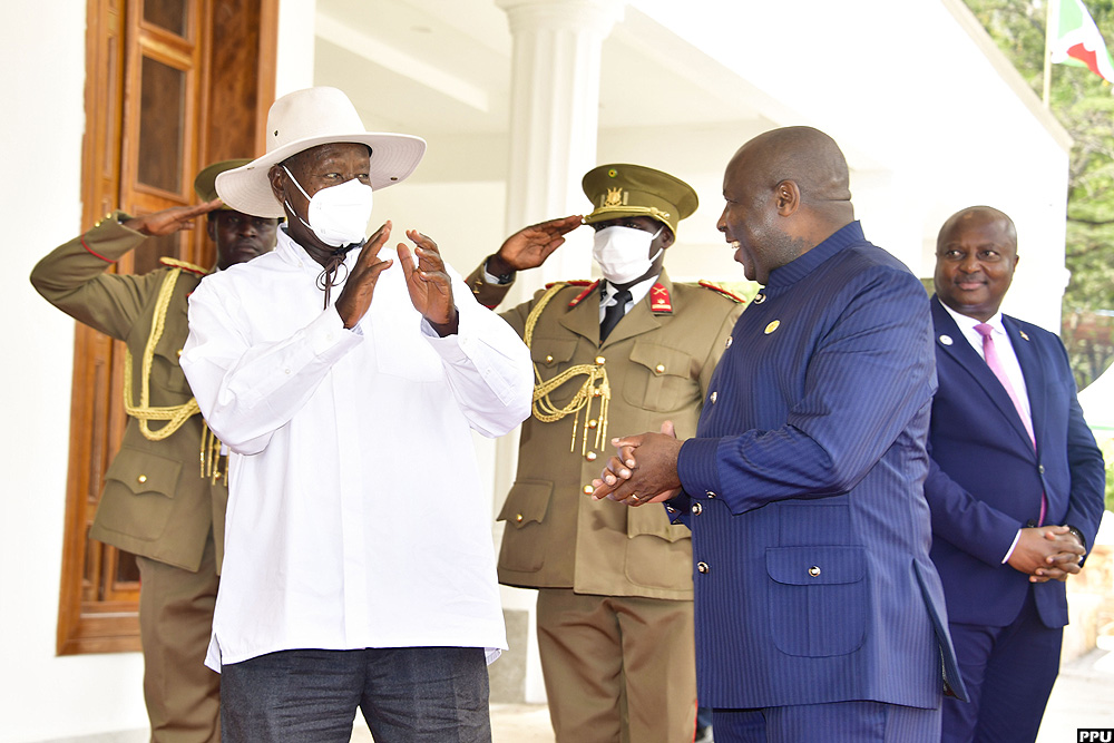 President Evariste Ndayishimiye (R) of Burundi welcomes President Yoweri Museveni at the summit venue in Bujumbura on May 6, 2023. (PPU)
