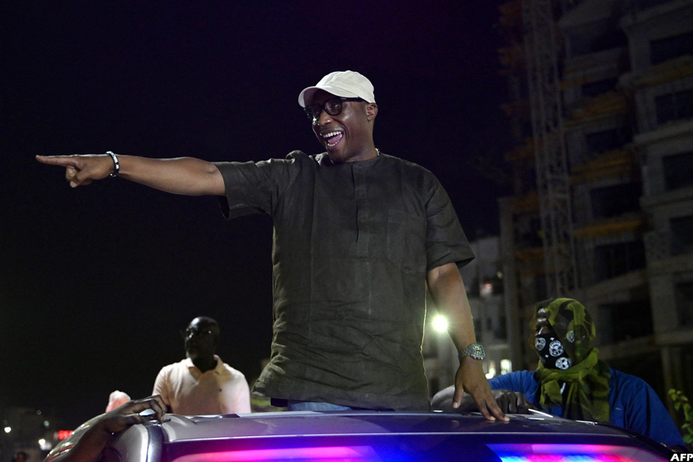 Mayor of Dakar Barthelemy Diaz (C), head of the national list of the Samm Sa Kadou coalition , gestures in a car with an open roof, as part of an electoral caravan for the early legislative election of November 17, 2024. (AFP)