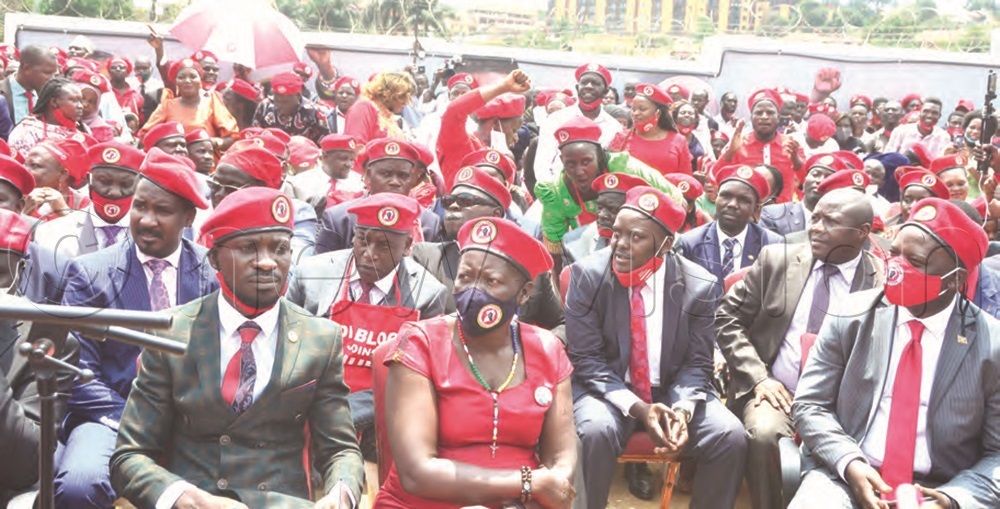 Kyagulanyi (front-row, left) with NUP and former DP members under DP block who joined his party in 2020. Ssewungu (second-left second row) has kept his loyalty to the NUP president, increasing his chances of winning the Kalungu West MP seat in the forthcoming 2026 elections.