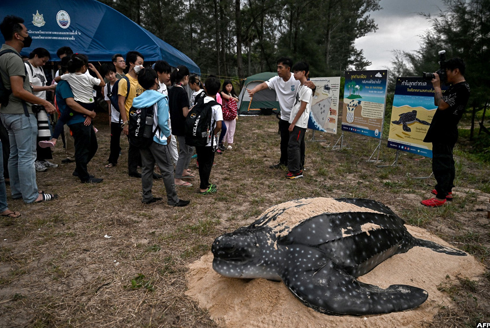 Secondary student Prin "Por" Uthaisangchai (2nd R) explains the behavior of turtles to his classmates prior to a hatchling leatherback sea turtle release on Bang Khwan Beach in Phang Nga, Thailand. (A