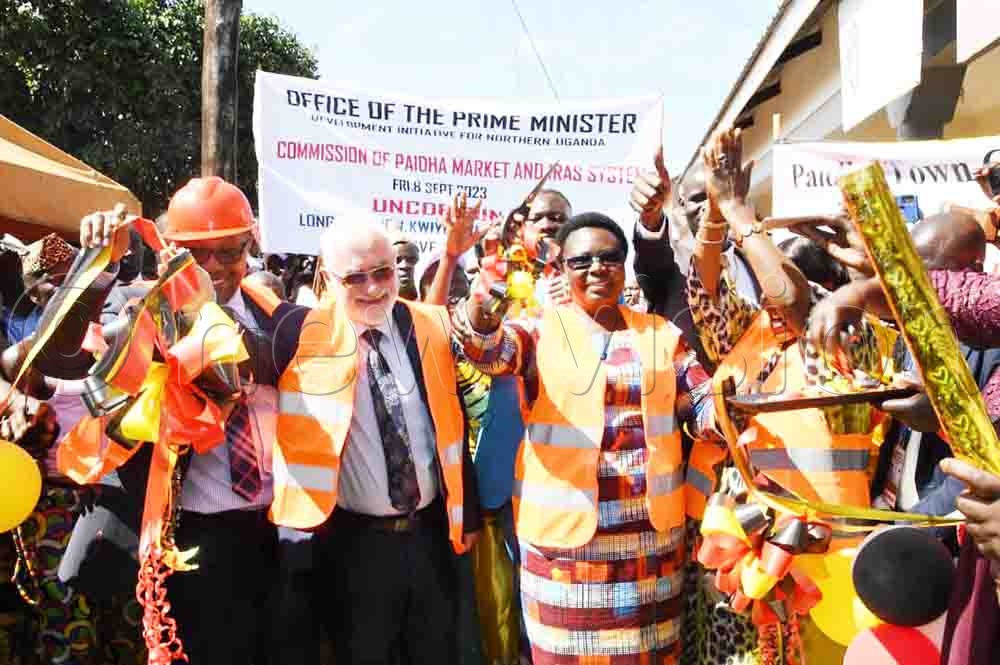 State minister for Northern Uganda Grace Freedom Kwiyucwiny, UNCDF head in Uganda Dr. Dmitry Pozhidaev, and other officials commission 30 lockups built by the EU in Paidha. (Credit: Eddie Ssejjoba)