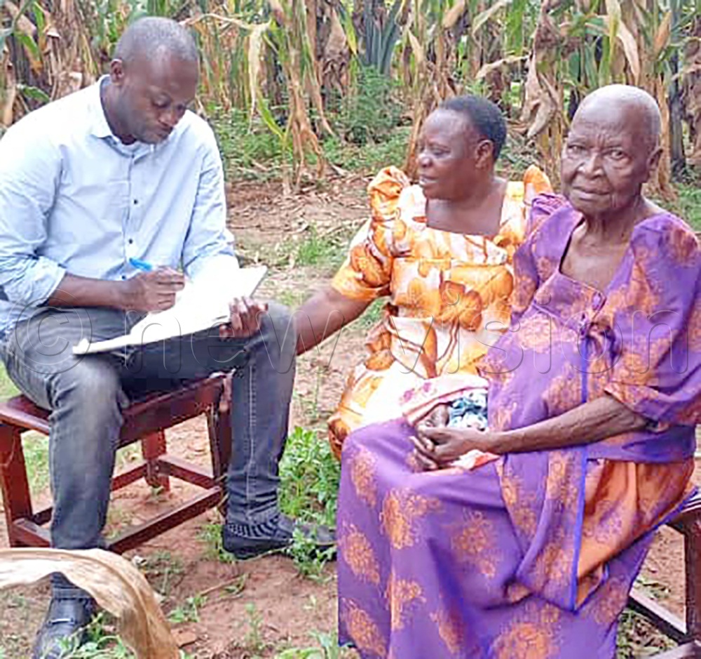 ‘New Vision’ journalist Umaru Kashaka interviewing Florence Namatovu (centre) and her mother Bensuseba Nanyonjo, who are battling the land grabber.