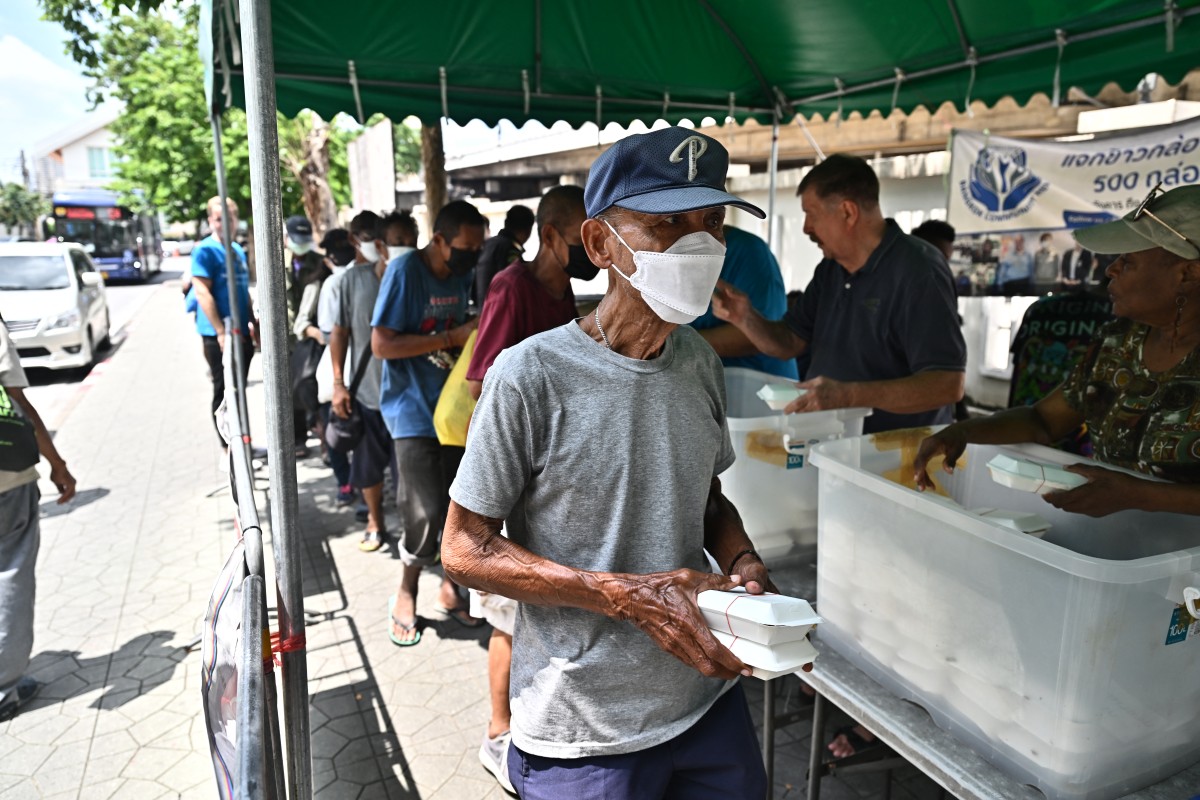 This photo taken on September 22, 2023 shows senior citizens receiving daily food donations from Bangkok Community Help Foundation, nearby the Grand Palace in Bangkok. (AFP)
