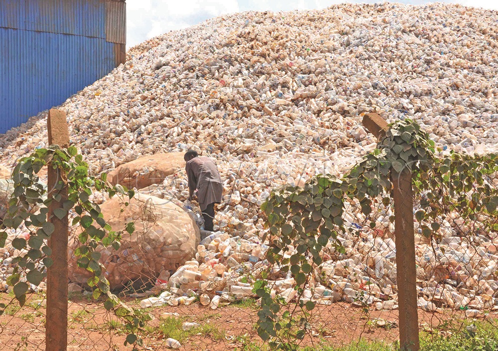 A man sorting plastic bottles at a collection centre in Kabojja, Nateete along Nakawuka Road