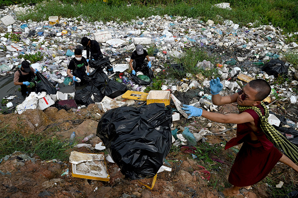 Volunteer students and Buddhist monks collect plastic waste from a sewage canal to set an example and educate people on proper plastic disposal in Phnom Penh on October 28, 2023. (AFP)