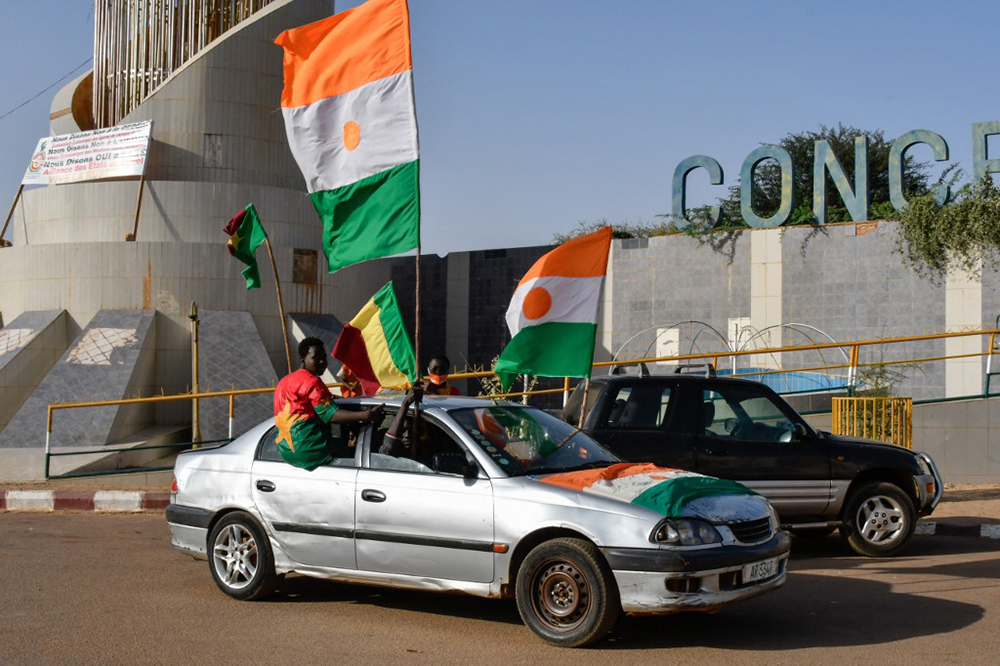 Supporters of the Alliance Of Sahel States (AES) drive with flags as they celebrate Mali, Burkina Faso and Niger leaving the Economic Community of West African States (ECOWAS) in Niamey on January 28, 2024. (AFP)