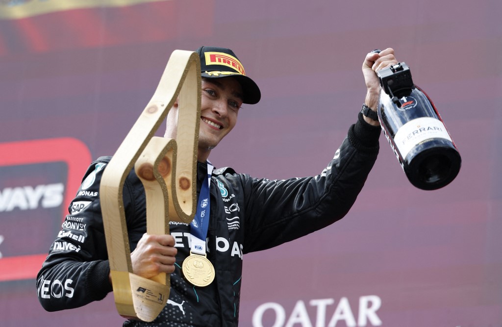Winner Mercedes' British driver George Russell celebrates with the trophy on the podium of the Formula One Austrian Grand Prix on the Red Bull Ring race track in Spielberg, Austria, on June 30, 2024. (Photo by AFP)