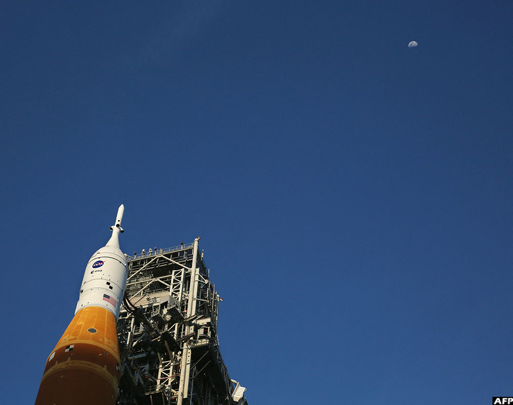 The immense orange and white Space Launch System rocket and the Orion vessel were to be slowly wheeled out of the Vehicle Assembly Building at the Kennedy Space Center in Florida, and painstakingly moved four miles (6.5 kilometers) to Launch Pad 39B.