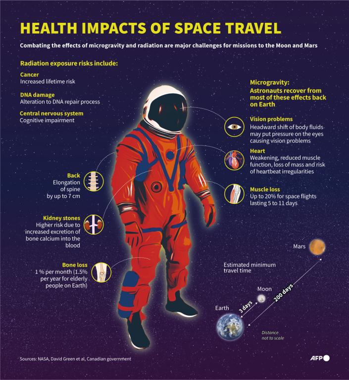 Infographic showing a schematic outline of the NASA's Artemis II mission voyage to take a crew of four in the Orion spacecraft around the Moon and back to Earth with the launch planned for early 2026. (AFP)