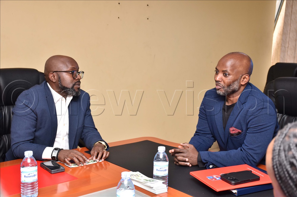 Vision Group CEO Don Wanyama sharing a light moment with Dr Lawrence Muganga, the Vice Chancellor of Victoria University. This was during a meeting at Victoria University. Photos by Simon Peter Tumwine