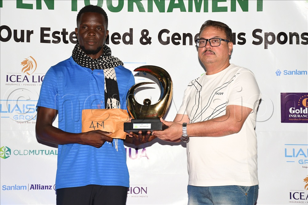 Group A winner Dennis Aguma (center) receives his prize from LIASON Group's Saraj Siryowe as Kinyara Golf Club captain Moses Enzama looks on.