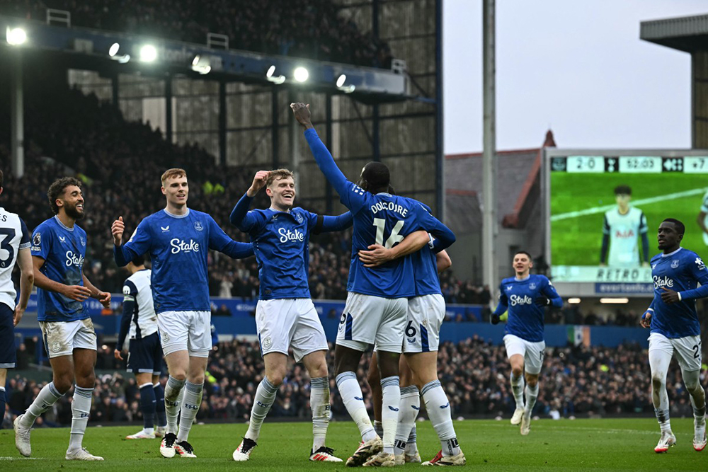 Everton's players celebrate after their third goal, an own-goal from Tottenham Hotspur's English midfielder #14 Archie Gray during the English Premier League football match between Everton and Tottenham Hotspur at Goodison Park in Liverpool, north west England on January 19, 2025. (Photo by Paul ELLIS / AFP)