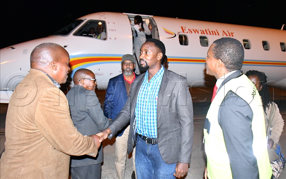 The Kyabazinga of Busoga William Gabula Nadiope IV (2nd R) greeting officials from Eswatini Kingdom as he was being received at King Mswati III International Airport in Eswatini Kingdom on Thursday night. Photo by Donald Kiirya