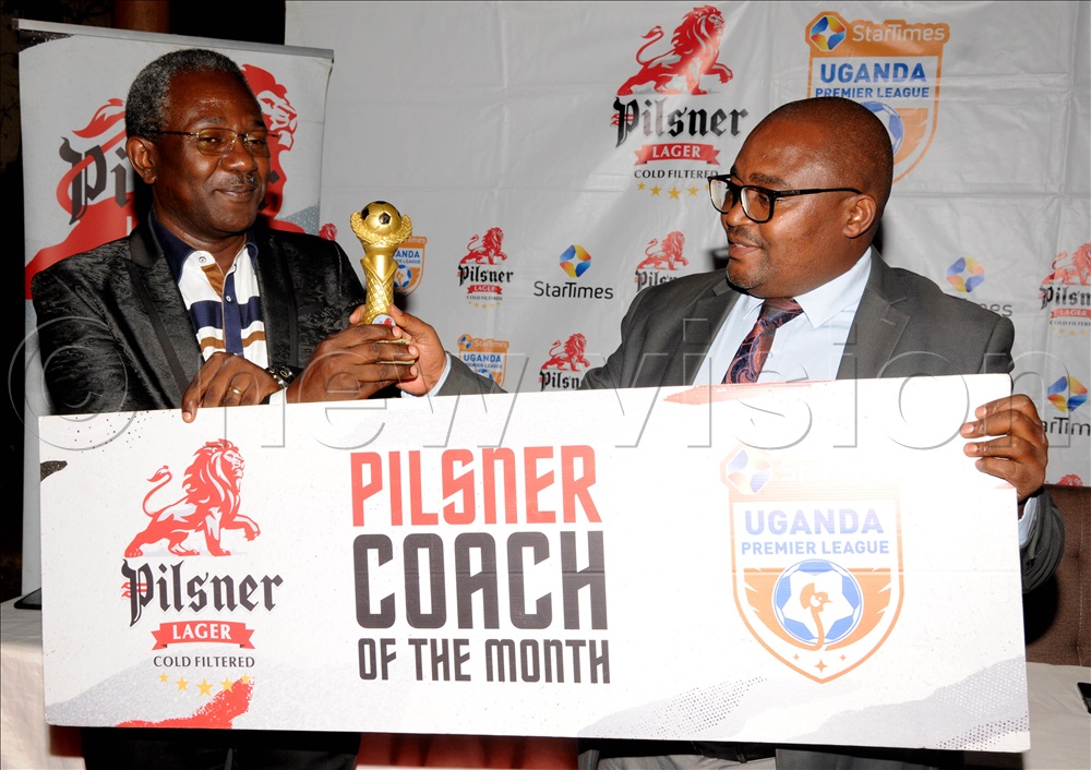 The CEO for Sports Club Villa, William Nkemba (left) representing the SC Villa Coach Dusan Stojanovic to receive the coach of the month UPL award at Kati Kati May 29 2024. Photos bt Silvano Kibuuka
