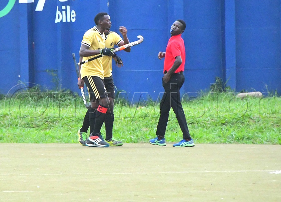 Match umpires Innocent Ascar (top) and Ronald Oketayot leave the pitch while Stallions Hockey Club coach Marktum Muziransa gathers his players after the match on April 20, 2026, at Lugogo. Photo by Silvano Kibuuka