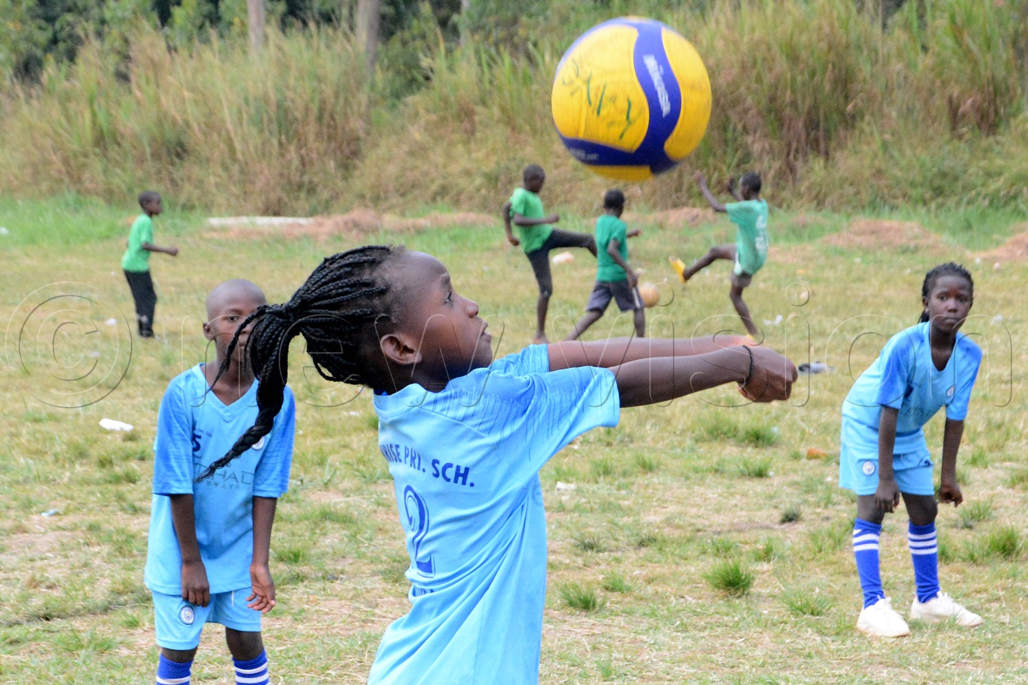 Sunrise Primary School's Trina Nuwasaramu in action during the KAVC Primary Schools Volleyball Championships at Namugongo Vocational School. Photo by Michael Nsubuga