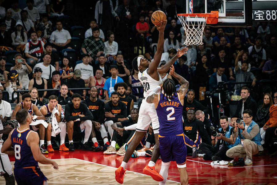 Thousands of fans cheered Friday as the Phoenix Suns -- led by four-time NBA All-Star Devin Booker -- beat the Brooklyn Nets, with celebrities such as David Beckham, actor Jackie Chan and Alibaba founder Jack Ma in front-row seats.