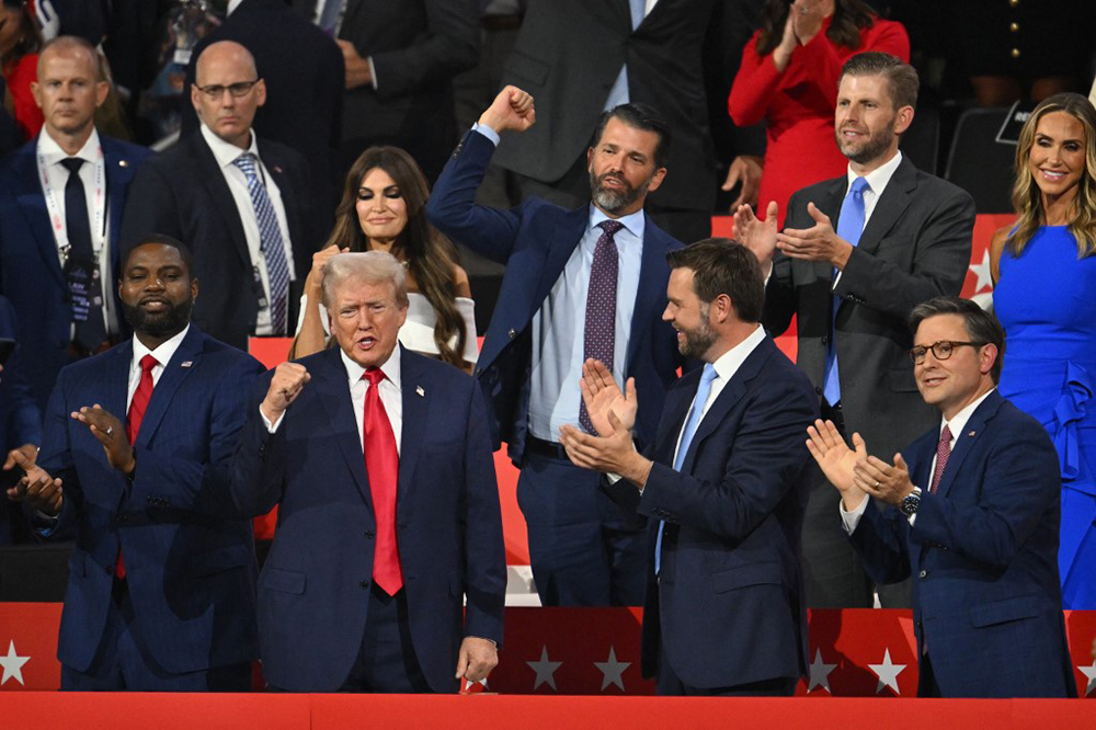US former President and 2024 Republican presidential candidate Donald Trump (bottom, 2nd L) cheers alongside (from bottom L) US Representative of Florida Byron Donalds, US Senator from Ohio and 2024 Republican vice-president candidate J. D. Vance, and House Speaker Mike Johnson, (from top R) Co-chair of the Republican National Committee Lara Trump, son Eric Trump, son Donald Trump Jr., and US TV news personality Kimberly Guilfoyle as he arrives during the first day of the 2024 Republican National Convention at the Fiserv Forum in Milwaukee, Wisconsin, July 15, 2024. (AFP)
