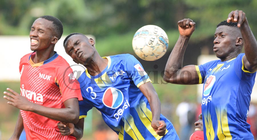 Sadat Kasaga (left) heads the ball past YMCAs Ibrahim Chandiga. Photos by Michael Nsubuga