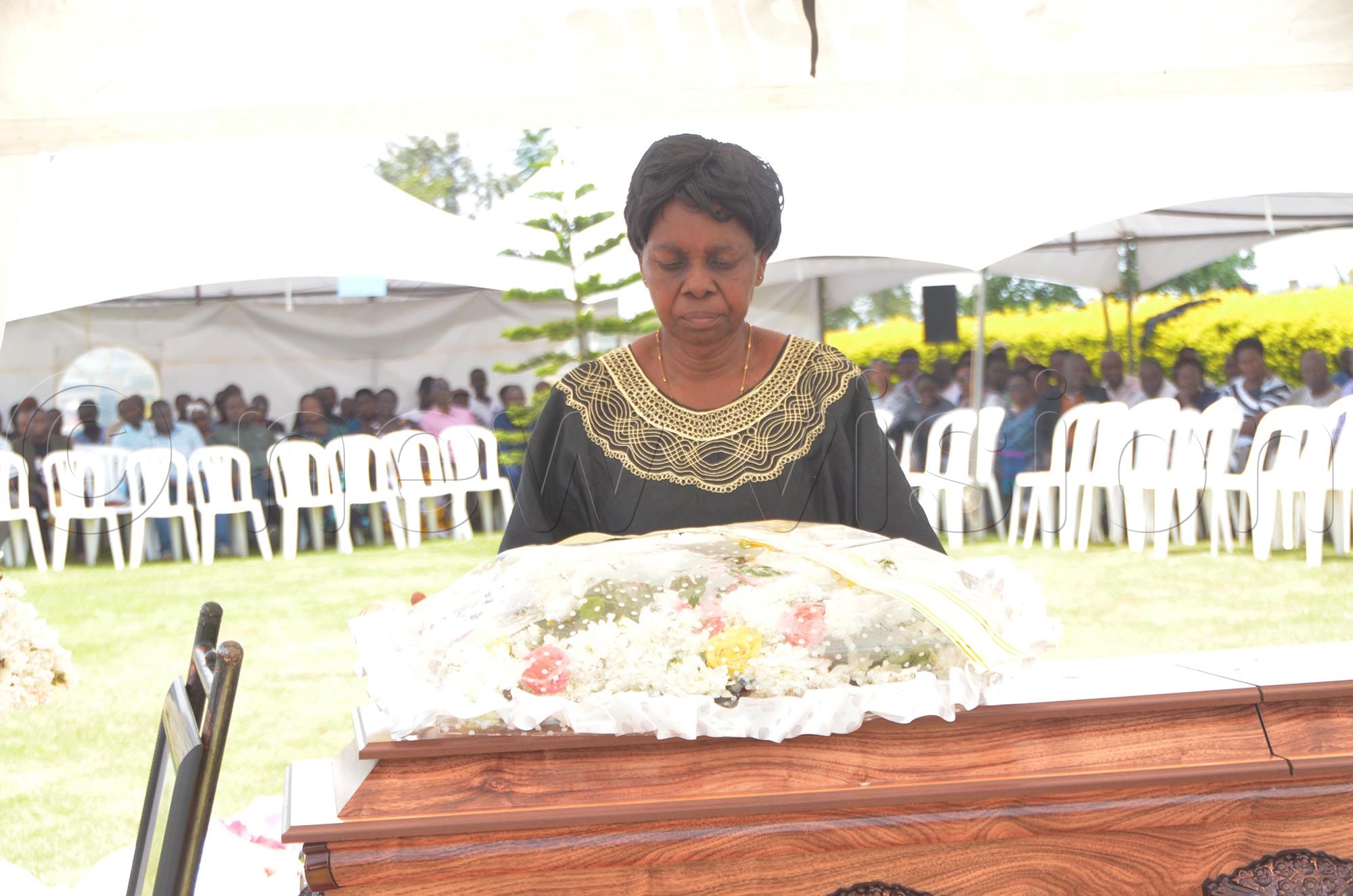 Barnabas Mwesiga’s widow Mary Mwesiga lays a wreath on his casket. Photo by Aloysius Byamukama