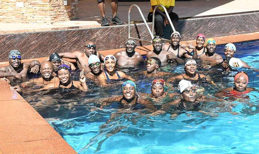 Uganda's Masters Swimming Team pose at the Speke Resort before they left for Nairobi to compete in the tenth Africa Aquatics Region 3 Swimming Championship at the Kasarani Aquatics Centre. Photo by Michael Nsubuga
