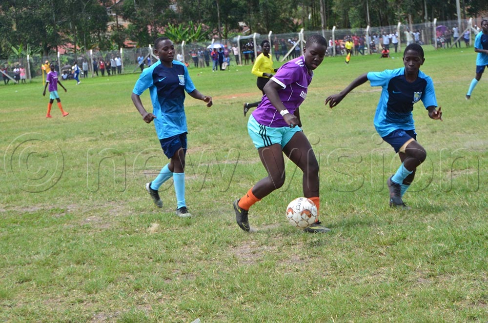 A Rines player (pupple) battles St Noa in the USSSA girls' football. The two will be vying for a semifinal slot in the rescheduled championship. (Credit: Aloysius Byamukama)