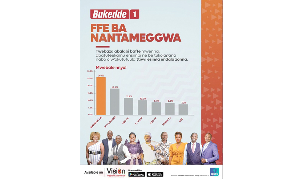 Okusinziira ku kunoonyereza okwakoleddwa ekitongole ky’ensi yonna ekya IPSOS, Bukedde TV 1 y’esinga okulabibwa mu Uganda ng’eri ku bitundu 26 ku 100, n’eddirirwa NTV ku bitundu 18 ku 100, NBS ebitundu 11 ku 100, TV West ebitundu 10 ku 100, KBS ebitundu 8 ku 100 n’endala ne zigoberera.