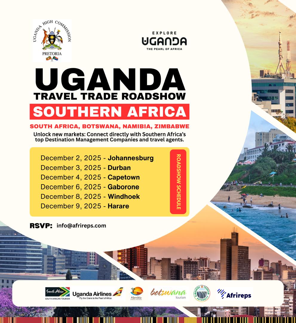 The delegation from the Pretoria mission on the Road show will travel to Johannesburg, Durban, Cape Town, Gaborone, Windhoek, and Harare to promote Uganda and expand cross-regional tourism collaboration.