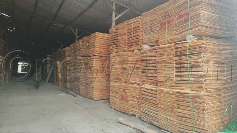Tropical veneer sheets, a product from eucalyptus trees grown by tree farmers being held up in internal container depots, stores, trucks and factories.